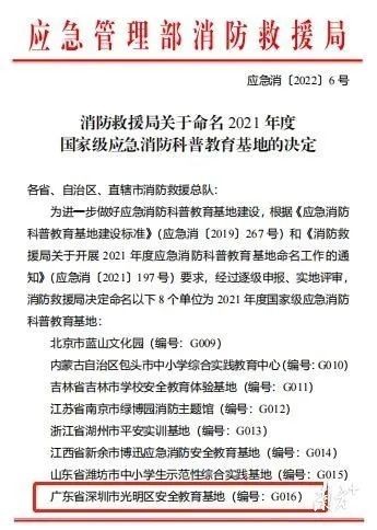 據了解,2021年度國家級應急消防科普教育基地,從全國范圍進行層層選拔,最終由國家應急管理部消防救援局評選,全國僅有8家單位獲評,深圳市光明區應急消防科普教育基地就是其中之一。它也是華南地區規模最大的安全教育基地,更是廣東首家國家級應急消防科普教育基地。