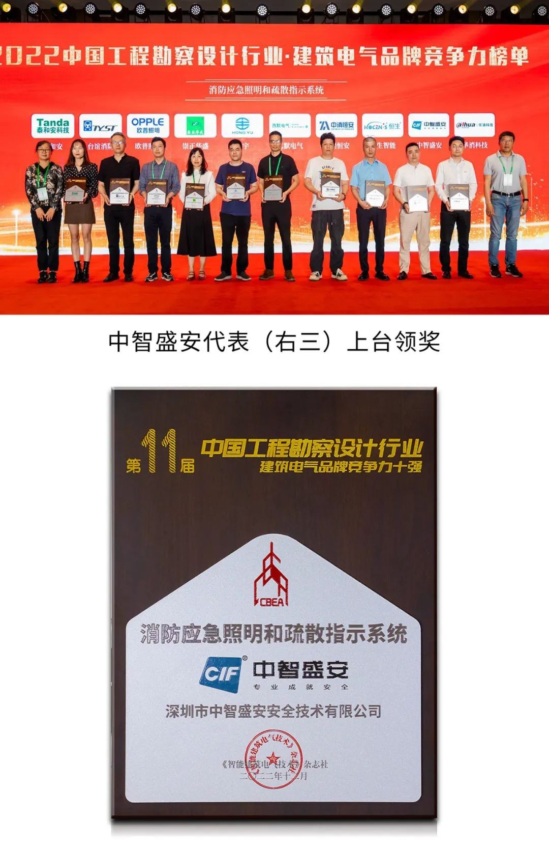 會(huì)上同期還舉行《2022中國(guó)工程勘察設(shè)計(jì)行業(yè)·建筑電氣品牌競(jìng)爭(zhēng)力報(bào)告》發(fā)布儀式暨頒獎(jiǎng)典禮。深圳市中智盛安安全技術(shù)有限公司(以下簡(jiǎn)稱(chēng)中智盛安)被評(píng)為消防應(yīng)急照明和疏散指示系統(tǒng)競(jìng)爭(zhēng)力十強(qiáng)企業(yè)。